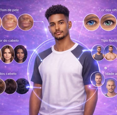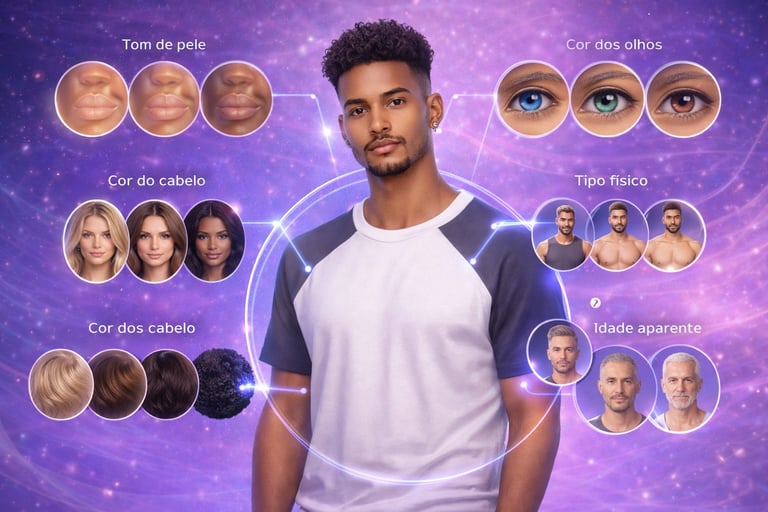 (tom de pele, cabelo, olhos, tipo físico, idade aparente)Estilo visual definido